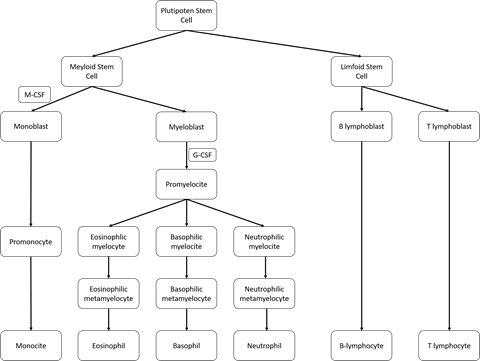 1) Mekanisme Leukopoiesis Pluripoten stem cell memiliki kemampuan untuk berdiferensiasi menjadi myeloid stem cell dan lymphoid stem cell. Jalur myeloid stem cell terbagi menjadi monoblast dengan dipengaruhi oleh M-CSF dan myeloblast. Myeloblast mengalami maturisasi menjadi promyelocyte dipengaruhi oleh G-CSF, selanjutnya berdiferensiasi menjadi eosinophilic myelocyte selanjutnya menjadi eosinophlic metamyelocyte dan matur menjadi eosinophil, basophilic myelocyte selanjutnya menjadi basophilic metamyelocyte dan matur menjadi basophil, neutrophilic myelocyte selanjutnya menjadi neutrophilic metamyelocyte dan matur menjadi neutrophil. Monoblast mengalami maturasi menjadi promonocyte dipengaruhi M-CSF dan matur menjadi moncyte. Pada jalur lymphoid stem cell, lymphoid stem cell dapat berdiferensiasi menjadi B-lymphoblast yang matur menjadi B-lymphocyte dan T-lymphoblast yang matur menjadi T...